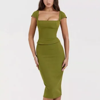 https://Green Sexy Women Two Piece Set – Square Collar Short Sleeve Tops And Midi Skirt Matching Sets
