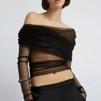 Sheer Mesh V-Neck Long Sleeve Sexy T-Shirt